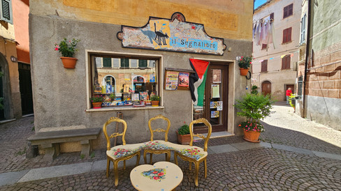 de koffie krijgen we een lokale lekkernij Amaretto. Een zacht soort bitterkoekje . En die is ook boven verwachting lekker. Tot nu toe waren de Italiaanse koekjes heel droog. Dan vallen ze in je mond als poeder uit elkaar, en moet je iets te drinken in de buurt hebben, om het weg te spoelen. We wandelen door het dorp langs piepkleine winkeltjes. De slager heeft het vlees herkenbaar hangen. De bakker ontdek ik omdat er achter een kralengordijn veel gelachten en gepraat wordt. Eerst zie ik de Palestijnse vlag en dan het bord dat een bakker doet vermoeden. Het is een oude bakkerswinkel. De dame achter de vitrine is zelf zeker 60+, en vertelt aan de hand van een foto dat haar vader en moeder hier al bakten. Destijds was dat op kolen, nu op gas. Dankzij mijn Spaanse-duolingo-woordenschat kan ik het Italiaans aardig volgen, en de dame noemt soms wat Engels woorden. Het brood is zo lekker dat Wil René een dag later weer de berg afdaalt om groot soort stokbrood te kopen. De enige supermarkt heeft boven verwachting een groot assortiment. Het is een pijpenla van twee gangpaden met stellingen tot aan de nok gevuld, net zoals in Marokko. En waar je regelmatig moet wachten tot een andere klant zijn keuze heeft gemaakt, omdat je elkaar nauwelijks kunt passeren.
